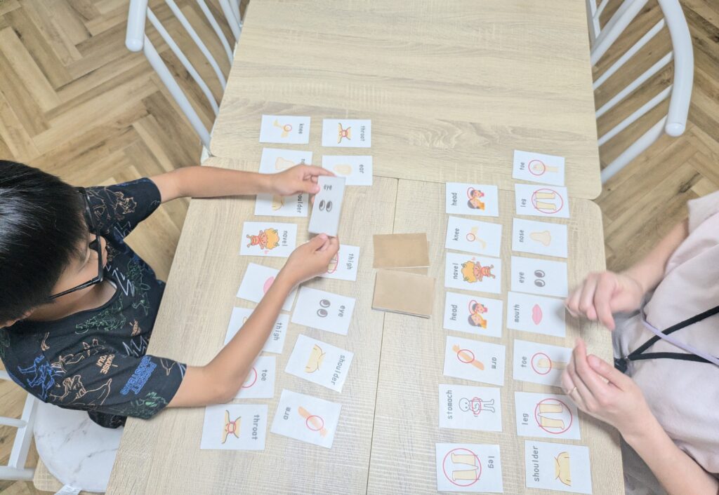 決まった教材ではなく、学年や子ども達の雰囲気を見て教材を考えます。時には歌やダンス、絵本の読み聞かせ、時にはカードゲームやすごろくなどを使用して「聞く」・「話す」力を伸ばし、子ども達の様子を見ながら「書く」・「読む」練習も行います。子ども達に合わせたオリジナルの教材を使用しながら楽しく学習が行える工夫をいっぱい行なっています。